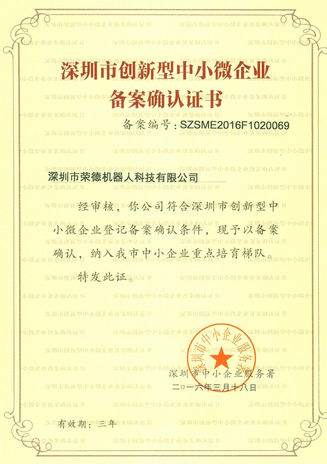 深圳市榮德機(jī)器人科技有限公司在2015年11月份提交了申請(qǐng)材料,經(jīng)過三個(gè)月的嚴(yán)格審核,終于在2016年3月18日獲得了創(chuàng)新型中小微企業(yè)證書。