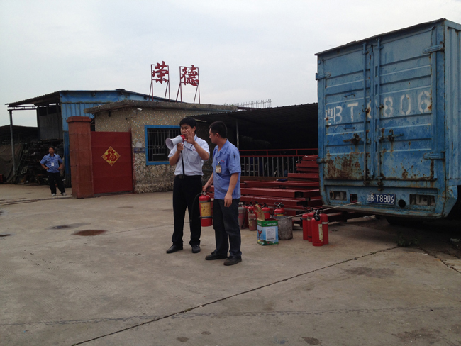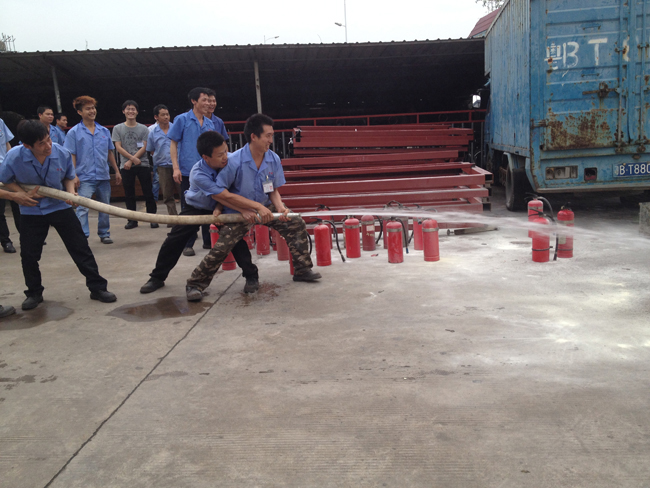 2、消防知識培訓(xùn)。等大家集中到了廠外安全區(qū)域后,由義務(wù)消防隊人員對全員進行滅火器材的使用方法。主要是干粉滅火器和消防栓的使用。安全主任謝京亮邊講解邊模擬使用傳授給所有員工滅火器的使用步驟:搖一搖、拔下插銷、瞄準火焰根部、壓下把手、來回掃射。