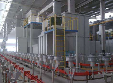 涂裝生產(chǎn)線主要工藝流程是上件→拋丸除銹→清理吹灰→噴鋁→底漆噴漆流平→底漆烘干→中涂噴漆流平→中涂烘干→面漆噴漆流平→面漆噴漆烘干→下件。涂裝線的防腐環(huán)境是室外(不直接淋雨),高架橋腹部波紋板。保護(hù)年限為長效型,50年。主要針對(duì)工廠構(gòu)件外表面涂漆,不考慮施工后涂裝。前處理拋丸,Sa3.0級(jí)、粗糙度/75-120um、清潔度/1級(jí)?;耐繉訛殡娀釃婁X,120-150μm;底涂層為環(huán)氧富鋅底漆,60-80μm,90℃60分鐘烘干。中間涂層為環(huán)氧云鐵中間漆,150-180μm;90℃90分鐘烘干。 面漆為丙烯酸聚氨酯或氟碳漆面漆,40-60μm。90℃60分鐘烘干。總漆膜厚度:≥250μm。